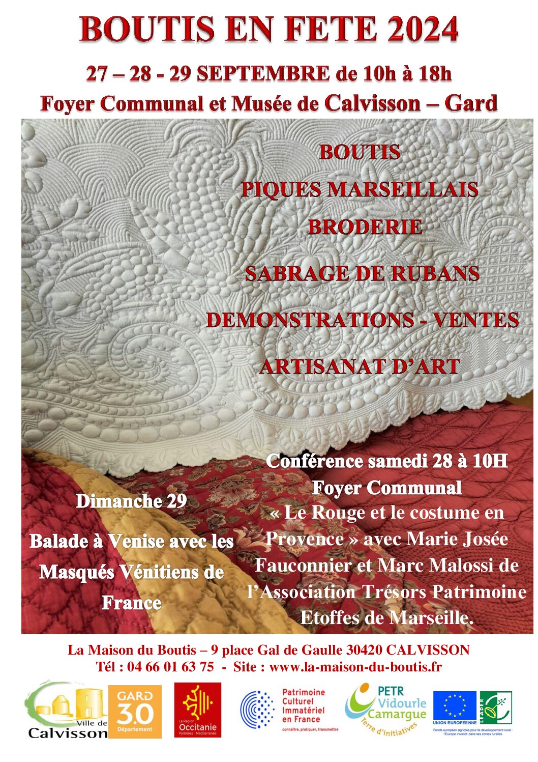 L’association « Les Cordelles Boutis en Vaunage » propose du 27 au 29 septembre 2024 sa grande exposition « Boutis et Piqués dans tous leurs états », mêlant les chefs d’œuvre brodés au Boutis par les adhérentes et des ouvrages réalisés en Piqué Marseillais ainsi que l’indiennage.
